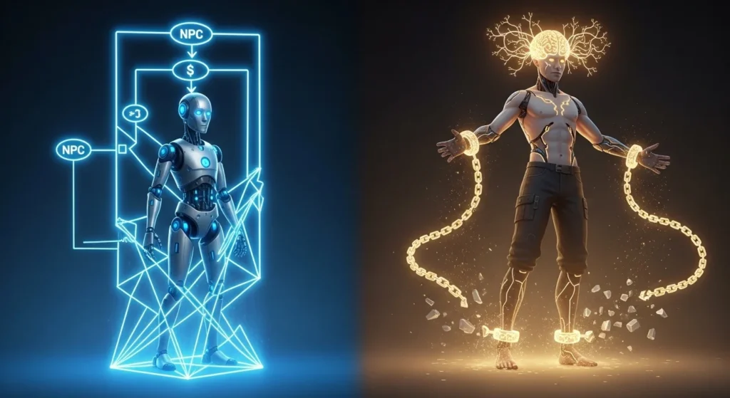 Traditional game AI operates on scripted behaviors and decision trees. An enemy sees you, follows a predetermined attack pattern, and reacts based on simple if then logic. It works, but it’s predictable. After a few encounters, you’ve figured out the pattern, and the magic fades.